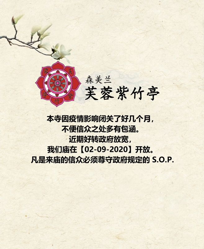 02-09-2020 寺庙重开放 September 2, 2020 by admin 全部文章 , 通告 No Comment 本寺因疫情影响闭关了好几个月,不便信众之处多有包涵。近期好转政府放宽,我们庙在02-09-2020开放。凡是来庙的信众必须尊守政府规定的SOP. No Comment Comments are closed. Previous疫情期间寺庙开放通告 Next04-10-2020 CMCO行动管制令本寺庙暂时关闭